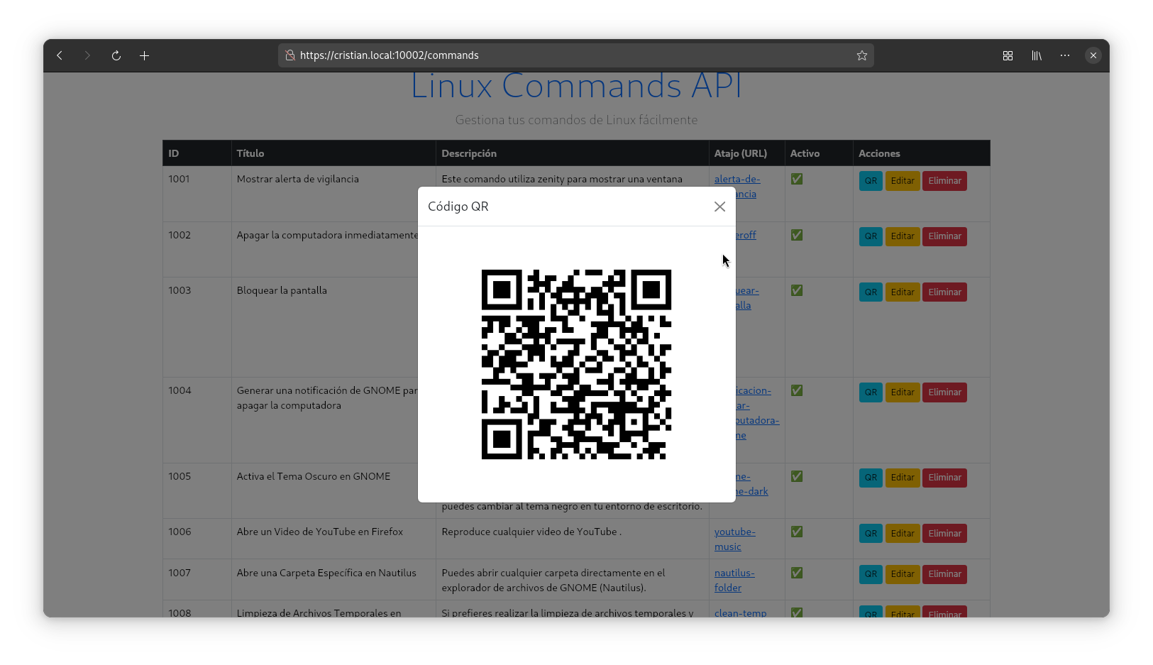 - Generar códigos QR para cada comando, lo que facilita su ejecución desde dispositivos móviles.