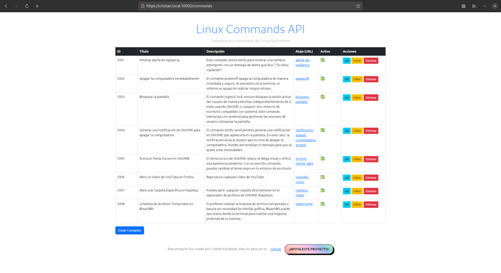 Puedes agregar, editar, eliminar y visualizar comandos Linux desde una interfaz web amigable. La aplicación está construida con Thymeleaf y Bootstrap, lo que la hace fácil de usar incluso para principiantes.